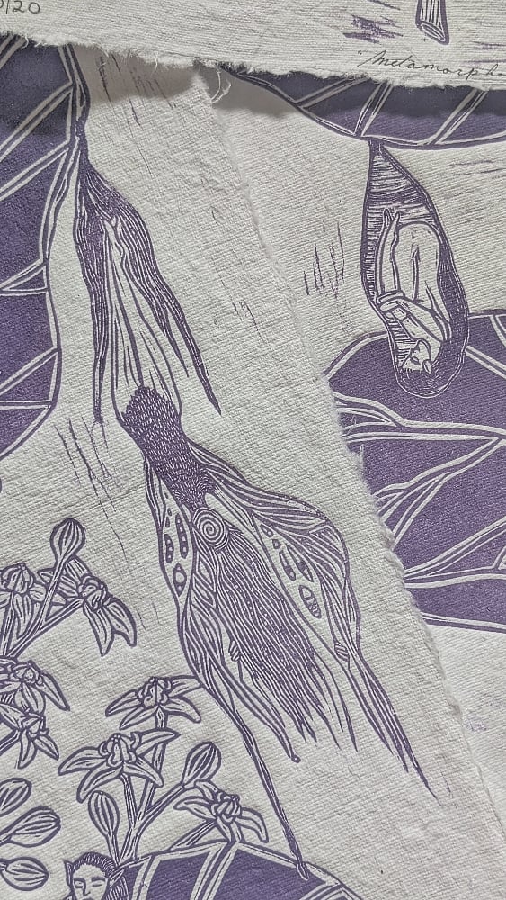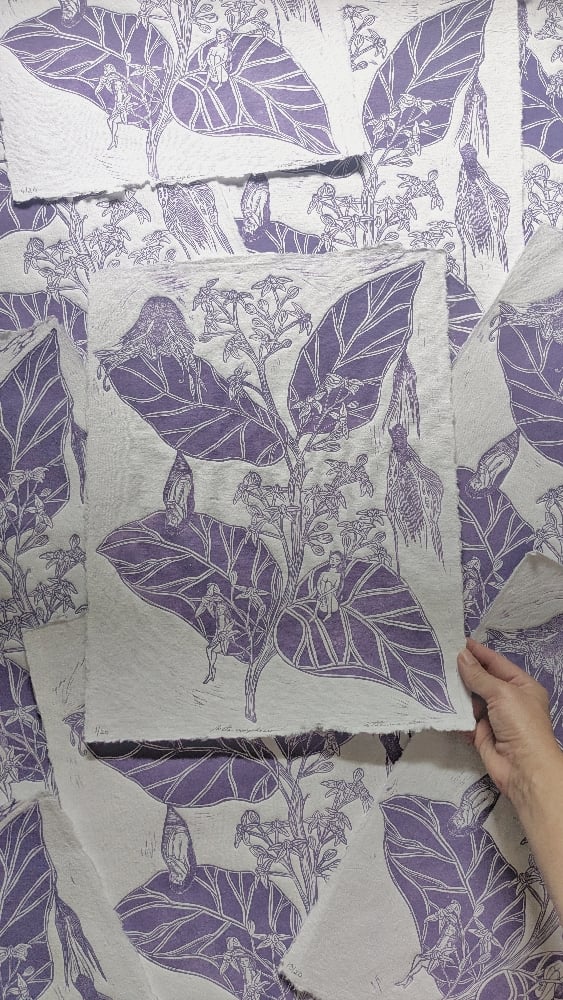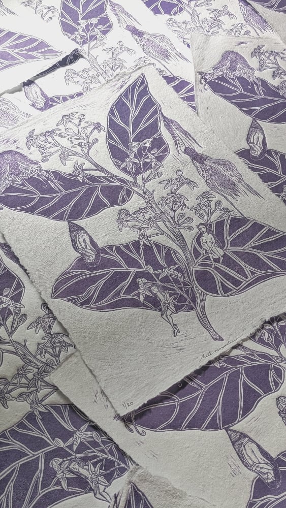 A limited edition of only 20 prints. This block is printed with a drusty purple ink on 12.5 x 16.5-inch cotton rag paper. It will be shipped and available at markets rolled in a tube for easy transportation.